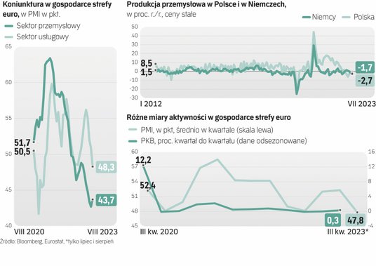 Każdy odczyt zbiorczego PMI poniżej 50 pkt oznacza teoretycznie, że więcej przedsiębiorstw raportuje spadek sprzedaży w porównaniu z poprzednim miesiącem niż jej wzrost. Dystans od tej granicy można interpretować jako miarę tempa spadku aktywności w gospodarce. W sierpniu, jak sugerują środowe dane, aktywność w strefie euro zmalała trzeci raz z rzędu, i to najbardziej od 33 miesięcy.