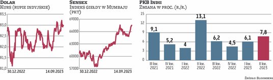 Gospodarka Indii jest obecnie piątą pod względem wielkości na świecie. Jej nominalny PKB to 3,7 bln dol. Pod tym względem Indie prześcignęły już Wielką Brytanię i Francję. Jeśli jednak liczymy udział w globalnym PKB według parytetu siły nabywczej, to Indie znajdują się – według Międzynarodowego Funduszu Walutowego – na trzecim miejscu (7,47 proc.), a wyprzedzają je tylko USA (15,39 proc.) oraz Chiny (18,9 proc.). 20 lat temu udział ten wynosił 4,3 proc., co plasowało Indie na piątym miejscu, między Niemcami a Rosją, a 30 lat temu sięgał 3,35 proc., co dawało Indiom ósme miejsce, między Francją a Brazylią. MFW prognozuje, że w 2028 r. udział Indii w globalnym PKB będzie wynosił 8,65 proc., czyli będzie łącznie większy niż Niemiec, Francji oraz Wielkiej Brytanii. Przez ostatnie 20 lat indyjski nominalny PKB powiększył się o 3,12 bln dol., czyli o prawie tyle, ile wynosi obecnie brytyjski PKB. Wielu analityków wieszczy Indiom długie lata dynamicznego rozwoju. Ekonomiści Goldman Sachs w lipcu przedstawili prognozę mówiącą, że przed 2075 r. Indie staną się drugą pod względem wielkości gospodarką świata. Mają wówczas prześcignąć pod tym względem USA. Na korzyść indyjskiej gospodarki przemawiają m.in. czynniki demograficzne. Ma ona wciąż bardzo dobry współczynnik ludności w wieku produkcyjnym do populacji zależnej finansowo (czyli do osób starszych i dzieci).