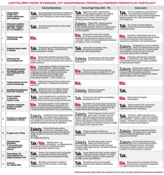 Szefowie ugrupowań opozycji demokratycznej zgodnie twierdzą, że są dogadani co do tworzenia nowego rządu. Dysponują potrzebną do tego większością głosów w parlamencie. Alternatywy dla nich nie widać. W tej sytuacji wkrótce rozpoczną się zapewne rozmowy o wspólnym programie dla nowego rządu. Wyprzedzając nieco te wydarzenia, wzięliśmy pod lupę kwestionariusze z pytaniami o ważne kwestie gospodarcze, które przed wyborami wypełniły dla „Rzeczpospolitej” i „Parkietu” wszystkie ogólnopolskie komitety wyborcze. Na ich podstawie spróbowaliśmy opisać zręby prawdopodobnego programu gospodarczego nowego rządu.