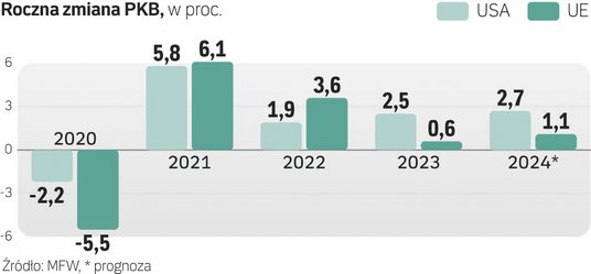 W 2000 r. władze Unii przyjęły strategię lizbońską, czyli plan rozwoju UE przewidujący, że w ciągu dziesięciu lat unijna gospodarka prześcignie gospodarczo USA. Ta strategia została już po kilku latach uznana za fiasko. Od 2000 r. średni wzrost PKB UE wynosił 1,2 proc., podczas gdy gospodarka amerykańska powiększała się przeciętnie o nieco ponad 2 proc. W 2000 r. PKB na głowę w USA wynosił 36,3 tys. USD, a w UE (licząc według parytetu siły nabywczej) 24 tys. USD. W 2023 r. ów wskaźnik wynosił odpowiednio dla tych gospodarek: 81,6 tys. USD i 57 tys. USD. Różnica w PKB na głowę mocno się więc powiększyła, co da się częściowo wytłumaczyć rozszerzeniem Unii o kraje uboższe. Ale to niejedyna przyczyna powiększenia się tej przepaści.