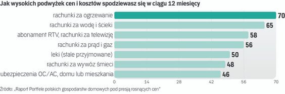 W badaniu wzięło udział 1001 dorosłych Polaków w wieku od 18 do 74 lat, którzy samodzielnie (65 proc.) lub wspólnie z innymi domownikami (35 proc.) płacą domowe rachunki. Dzięki temu są oni dobrze zorientowani zarówno w swoich finansach, jak i w kosztach życia, które muszą pokrywać. Ankietowani spodziewają się, że w ciągu najbliższych 12 miesięcy najmocniej, bo aż o 70 proc. (średnia wskazań), wzrosną ceny opłat za ogrzewanie. Badani spodziewają się też mocnego wzrostu rachunków za wodę i ścieki (o 65 proc.), abonamentu RTV i opłaty za telewizję (o 58 proc.), rachunków za prąd i gaz (o 56 proc.) oraz cen leków, które przyjmują stale, o 50 proc. Lista podwyżek jest bardzo długa. Są na niej także polisy komunikacyjne OC i AC, a także te na dom czy mieszkanie, rachunki za wywóz śmieci, telefon i internet, bilety okresowe komunikacji miejskiej czy koszty wynajmu mieszkania. Na końcu listy znalazły się kredyty hipoteczne, gdzie respondenci spodziewają się ich wzrostu o 17 proc. Przewidują oni także wzrost czynszu o 26 proc. i abonamentu na siłownię, do klubu fitness bądź na basen o 30 proc.