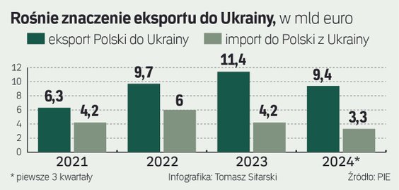 Dane mogą nieco zaskakiwać, bo o ile eksport Polski w 2024 r. roku się skurczył, to nie w zakresie wysyłki do Ukrainy. Tutaj notujemy spektakularne wzrosty od czterech lat, w czym nie przeszkodziła, a paradoksalnie wręcz pomogła, inwazja Rosji. Tak więc: w 2023 r. polski eksport do Ukrainy wyniósł już 11,4 mld euro, a startowaliśmy w 2021 r. z poziomu 6,3 mld, rok później było to już 9,7 mld euro. Za ubiegły rok znamy dopiero wynik pierwszych trzech kwartałów, ale nawet w tym czasie eksport dobił wartości 9,4 mld euro, co zdaniem ekonomistów PIE wskazuje na dalsze zacieśnianie relacji handlowych między państwami.
