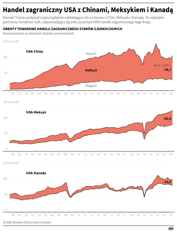 Cła w wysokości 25 proc. zostały nałożone na cały import z Meksyku i na wybrane towary z Kanady. W przypadku tego kraju, niższym 10 proc. cłem zostaną obłożone ropa naftowa, energia elektryczna oraz gaz naturalny. O 10 proc. zdrożeje cały import z Chin.