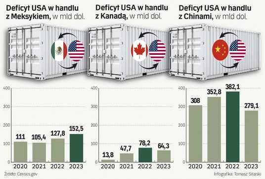 Cła wchodzą w życie we wtorek tuż po północy. Rozporządzenie o ich wprowadzeniu prezydent Donald Trump wydał na podstawie International Emergency Economic Powers Act, motywując je zagrożeniem ze strony nielegalnych imigrantów, śmiercionośnych narkotyków, w tym fentanylu. – Chiny, Kanada i Meksyk zalewają Stany Zjednoczone fentanylem, który zabija setki tysięcy Amerykanów rocznie – powiedział. Chodzi jednak przede wszystkim o ogromne deficyty handlowe, które mają USA z tymi krajami.