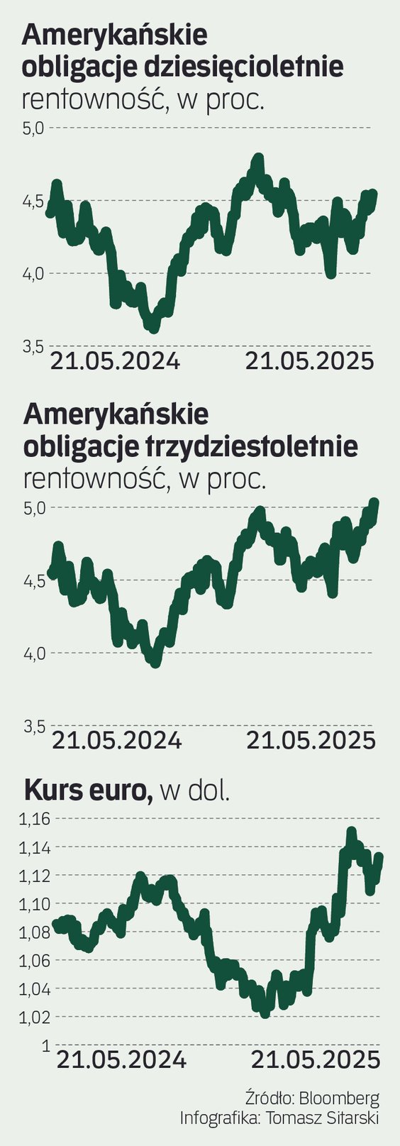 Na nastroje inwestorów wpłynęła nie tylko sprawa utraty najwyższego ratingu przez USA w agencji Moody’s. Do wzrostu rentowności obligacji przyczynia się również świadomość inwestorów, że Fed nie będzie się spieszył z obniżkami stóp procentowych i że prezydent Stanów Zjednoczonych Donald Trump dąży do przedłużenia obowiązywania cięć podatków, które wdrożyła jego pierwsza administracja w 2017 r. Cięcia te mogą przyczynić się do wzrostu amerykańskiego długu publicznego.