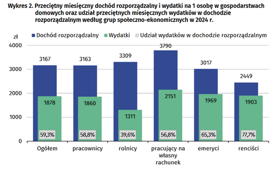 Przeciętnie rodziny w Polsce miały o realnie 14 proc. wyższe dochody rozporządzalne (czyli po zapłaceniu podatków i składek) w porównaniu do sytuacji sprzed dwóch lat. Wydatki były zaś realnie wyższe prawie o 11 proc. Udział wydatków w dochodzie rozporządzalnym zmalał z 61,1 proc. w 2023 r. do 59,3 proc. w 2024 r. Dziesięć lat temu było to aż ponad 80 proc. To, że systematycznie zmniejsza się udział wydatków w dochodach, obrazuje wzrost zamożności społeczeństwa.