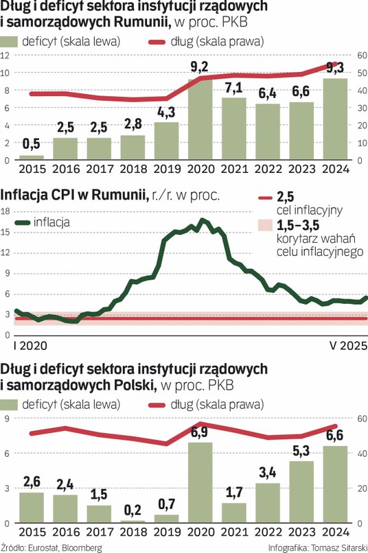 Co jednak najistotniejsze, Rumunia podąża ścieżką gwałtownego wzrostu długu publicznego. W 2024 r. doszedł on do blisko 55 proc. PKB, wobec raptem 35 proc. w 2019 r. Kraj od 2020 r. rokrocznie ma deficyt sektora finansów publicznych na poziomie ponad 6 proc. PKB. – Rumunia przez długi czas utrzymywała dyscyplinę fiskalną, a potem to „pękło” Rumuni doszli do wniosku, że mogą sobie pozwolić na pewną rozrzutność. I ona stała się stanem permanentnym – tłumaczy Borowski.
