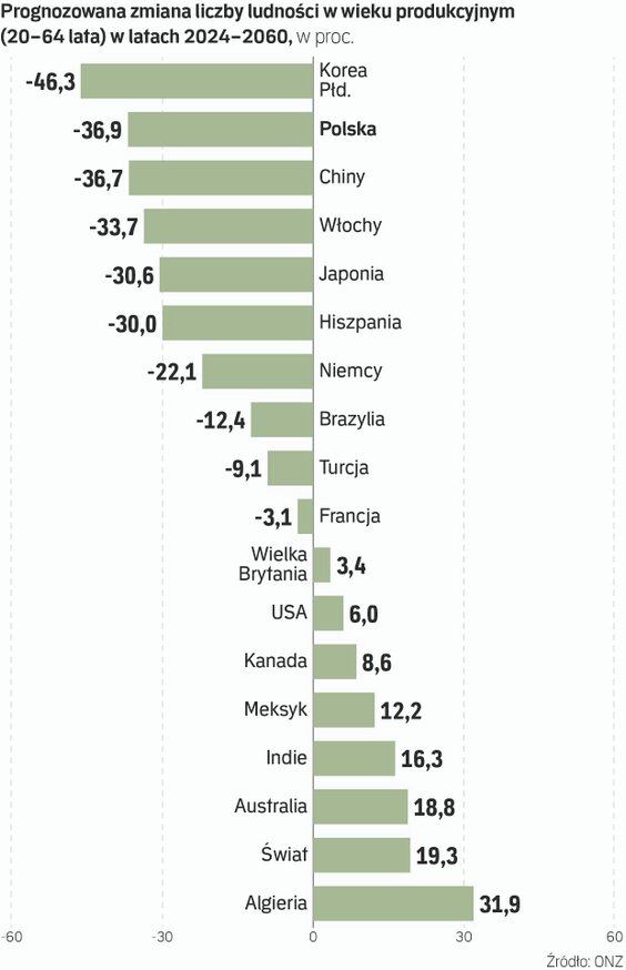 Dla krajów OECD wskaźnik obciążenia demograficznego liczony jako udział osób w wieku 65 lat i więcej względem populacji osób w wieku produkcyjnym (20–64 lata) urośnie między 2023 a 2060 r. z 32 do 53 proc. Co kluczowe, Polska będzie jednym z krajów najmocniej uderzonych zmianą demograficzną – u nas ten wskaźnik urośnie według prognoz OECD z 32 do 76 proc. Z szacunków organizacji wynika, że pomiędzy 2024 a 2060 r. ubędzie w Polsce 37 proc. osób w wieku produkcyjnym – ich liczba spadnie z 23 mln do 14,5 mln. To zaś uderzy w nasz potencjał rozwojowy, obniżając nasze średnie rocznie tempo wzrostu PKB na osobę z około 4 proc. w latach 2006–2019 do 2,5 proc. w latach 2024–2060. – Tylko Polska, Słowacja i Chile zaliczą tak silne wyhamowanie – wskazuje Andrzej Kubisiak, zastępca dyrektora w Polskim Instytucie Ekonomicznym.