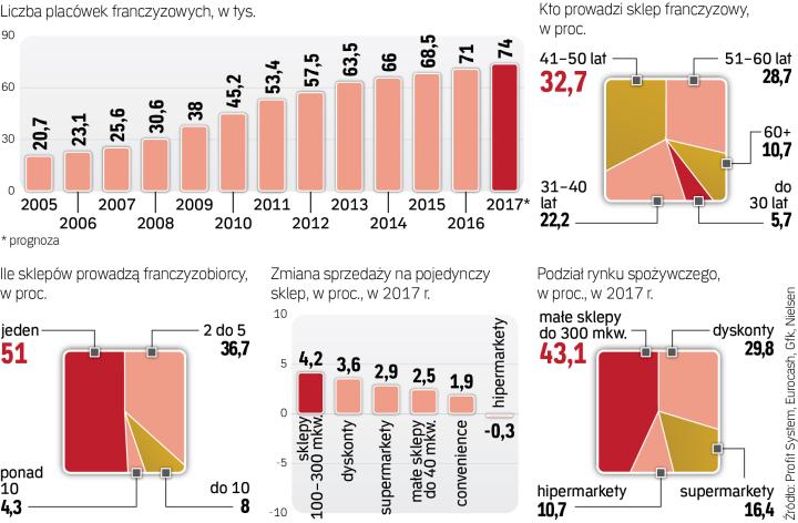 W systemie franczyzowym rozwija się wiele firm – zarówno mniejszych sieci, jak i potentatów na rynku handlowym. W ten sposób działa np. francuska grupa Carrefour, która tylko w drugim kwartale 2017 r. powiększyła się o 20 sklepów osiedlowych w sieci franczyzowej. – Sklepy osiedlowe to ważny element strategii rozwoju, od stycznia 2017 uruchomiliśmy już prawie 50 nowych placówek i pracujemy nad utrzymaniem tego tempa – mówi Marek Lipka, dyrektor ds. sklepów convenience Carrefour Polska. – Wśród nowych sklepów znalazły się również te z szyldem Globi, a także specjalistyczne placówki z logo Galerie Alkoholi, które oferują klientom szeroki wybór produktów alkoholowych ze wszystkich kategorii – dodaje.