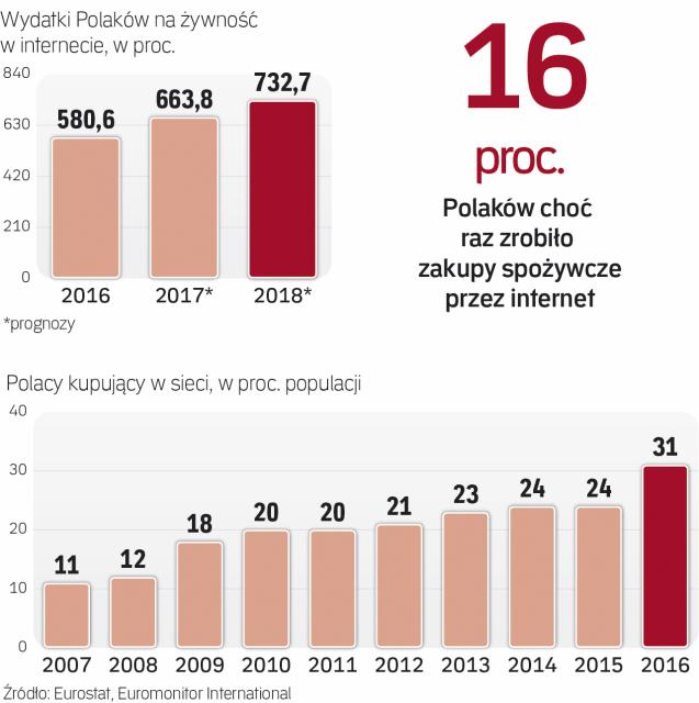 Polacy powoli przekonują się do kupowania żywności przez internet, takie transakcje ma za sobą ok. 16 proc. badanych. Ich wartość również jest skromna – wynosi jedynie 17 zł rocznie na głowę mieszkańca. Jednak według Euromonitor International spożywczy e-commerce rośnie w tempie 15–20 proc. rocznie i najbliższe lata zapowiadają się podobnie.