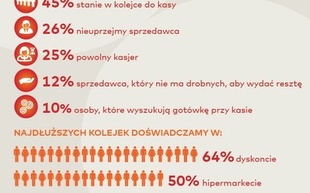 W czasie robienia zakupów bardzo często mamy nieprzyjemne odczucia, gdy musimy stać w kolejce do kasy. Z badań wynika, że aż 71 procent polskich konsumentów jest niezadowolona tylko i wyłącznie dlatego, że musi poczekać w ogonku do kasy. Chcemy, by zakupy były jak najszybsze, można rzec, że ideałem byłaby sytuacja, w której w ogóle nie tracilibyśmy czasu na stanie w kolejce. A stykamy się z tym zjawiskiem często – 64 procent badanych męczy się w dyskontach, 50 procent w hipermarketach. Najrzadziej stoimy w kolejkach w małych osiedlowych sklepach.