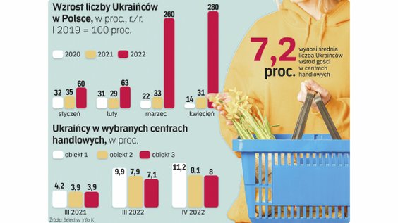 Zmiany widać także w centrach handlowych, co potwierdza analiza firmy Selectivv, dokonana dla „Rzeczpospolitej” na podstawie ruchu telefonów komórkowych. Wynika z niej, że kwietniu średnio ponad 7 proc. osób w centrach handlowych stanowili Ukraińcy, ale wśród analizowanych obiektów były też takie z dwucyfrowym wynikiem. W przypadku każdego obiektu liczba ukraińskich gości rośnie z miesiąca na miesiąc.