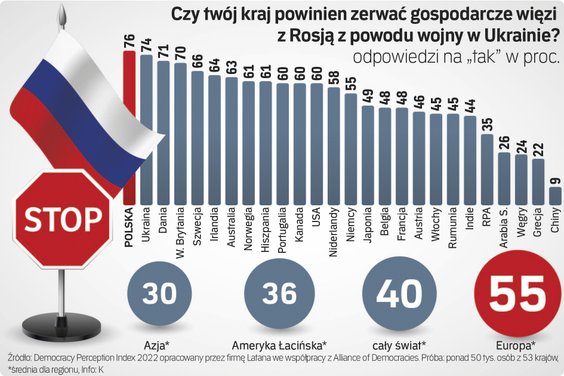 Uczestników ankiety zapytano też, czy są gotowi na zerwanie więzi gospodarczych z Rosją. Kraje, które aktywnie potępiły atak na Ukrainę i nałożyły sankcje na Kreml, stanowią obecnie ponad 60 proc. światowego PKB. Obywatele tych państw popierają taką politykę. W 31 krajach większość respondentów odpowiedziała pozytywnie na pytanie o zerwanie stosunków gospodarczych z Rosją. Największymi zwolennikami są Polacy – 76 proc., przed Ukraińcami – 74 proc., i Duńczykami – 71 proc.