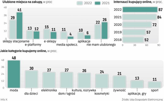 Z raportu wynika również, że w tym roku znacząco wzrósł odsetek osób, które deklarują, że ich zakupy internetowe są większe niż stacjonarne. Widać to w każdej z pięciu analizowanych kategorii. W przypadku odzieży mówi tak 29 proc., czyli aż 16 pkt proc. więcej niż rok wcześniej. Taki sam wzrost wskazań odnotowały internetowe wydatki spożywcze, wskazane przez 23 proc. Generalnie już ponad 60 proc. badanych deklaruje, że ich wydatki w sieci są większe lub przynajmniej takie same, jak w sklepach stacjonarnych. Można oczekiwać dalszego wzrostu tego wskaźnika kosztem handlu tradycyjnego.