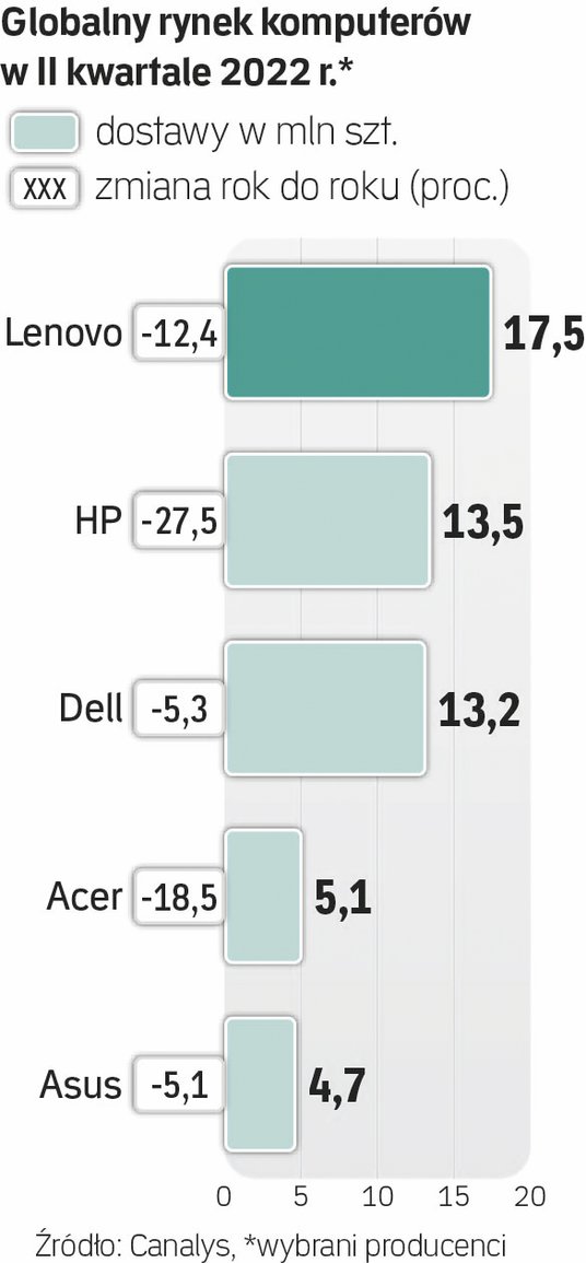 I tak największy producent w branży, firma Lenovo, zaliczyła w II kwartale ponad 12-proc. spadek sprzedaży. W przypadku tajwańskiego Acera było to już 18,5 proc., zaś amerykańskiego HP – aż 27,5 proc. Spowolnienie dotknęło też rynek monitorów. Jak przewiduje IDC, spadek dostaw takich urządzeń w całym 2022 r. sięgnie 2,5 proc. Prognozy wskazują, że problem nie zostanie szybko rozwiązany, bo eksperci zakładają dalszą redukcję sprzedaży – o kolejne 1,5 proc. – w 2023 r.