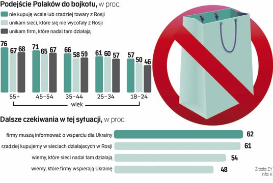 Z badania firmy EY, które „Rzeczpospolita” poznała jako pierwsza, jasno wynika, że większość Polaków nadal deklaruje dużą stanowczość w stosunku do wybierania produktów pochodzących z Rosji. Podobnie zdecydowanie podchodzą do firm, które w Rosji nadal działają, a niespotykana wcześniej presja ze strony konsumentów spowodowała istną ucieczkę zachodnich firm z tego kraju.