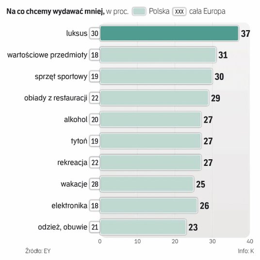 Ogółem zwolennicy zaciskania pasa przeważają, zarówno w Polsce, jak i całej Europie. Najczęściej wymieniane są takie kategorie, jak posiłki z restauracji czy artykuły luksusowe, ale wysoko są również te na alkohol czy tytoń. Branża alkoholowa szykuje się na zmiany: co prawda sprzedaż wódki i piwa spadała od dawna, ale w przypadku wina rosła, widać też było zainteresowanie droższymi kategoriami. Teraz zapewne trzeba się liczyć z trendem odwrotnym.