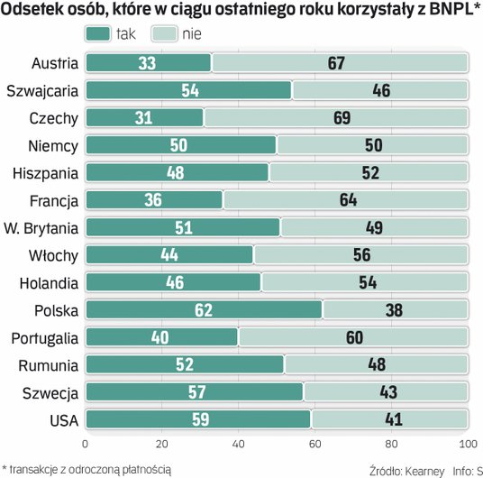 Jak podaje Kearney, już niemal połowa Europejczyków skorzystała z opcji BNPL. Na tym tle wyróżnia się nasz kraj, gdzie w ub.r. zakupy tą metodą płatności sfinansowało ok. 62 proc. respondentów. Tuż za nimi znaleźli się Szwedzi (58 proc.), a trzeba zaznaczyć, że to właśnie Skandynawia uchodzi w branży jako region, gdzie BNPL cieszy się największą popularnością. Z kolei ów odsetek w Czechach czy Austrii to 31–33 proc.