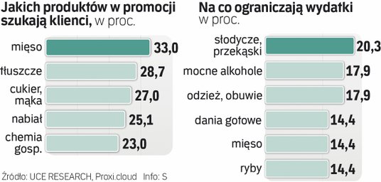 Widać to po klientach dyskontów (czyli zdecydowanych liderów handlu spożywczego z 40-proc. udziałem). Z analizy UCE Research i Proxi.cloud wynika, że najczęściej na promocjach poszukiwane jest mięso – wskazał to co trzeci badany. Nieco mniej wskazań zebrały nabiał i produkty sypkie. Z badania wynika, że jedynie 16,6 proc. badanych nie ogranicza obecnie podstawowych wydatków. Wśród pozostałych największa grupa wymienia słodycze, słone przekąski i mocne alkohole.