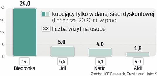 Mimo silnej konkurencji zarówno ze strony innych segmentów rynku, jak i sieci dyskontowych, to pozycja Biedronki jest coraz mocniejsza. Z analizy zachowań ponad 280 tys. klientów wynika, że w I półroczu ta sieć odpowiadała za 63,6 proc. wszystkich koszyków w sklepach dyskontowych. Siłą firmy jest też lojalność konsumentów, aż 24 proc. jej klientów nie zaopatruje się u konkurencji, a przeciętny kupujący był w jej placówkach o 20,9 proc. częściej niż rok wcześniej.