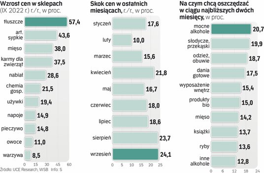Z monitoringu cen w ponad 40 tys. sklepów detalicznych prowadzonego przez UCE Research i Wyższe Szkoły Bankowe wynika, że we wrześniu zakupy były droższe średnio o 24,1 proc. niż rok wcześniej. Zdrożała każda z analizowanych kilkunastu kategorii. Nawet krajowe owoce i warzywa, o tej porze roku najtańsze.