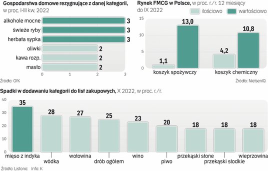 Oszczędności widać także w przypadku żywności, co przekłada się także na miejsca robienia zakupów. – Rośnie ich częstotliwość w dyskontach i supermarketach lokalnych, a w sklepach małoformatowych sieciowych nie maleje, podczas gdy w małym formacie niesieciowym częstotliwość maleje o 7 proc. – szukamy zatem placówek potencjalnie atrakcyjnych cenowo i asortymentowo – mówi Szymon Mordasiewicz, dyrektor komercyjny Panelu Gospodarstw Domowych GfK Polonia. – Po dziewięciu miesiącach roku 2022 dyskonty, supermarkety lokalne i mały format sieciowy odpowiadały za 63,7 proc. zakupów gospodarstw domowych i umocniły swoją pozycję o 3 pkt proc. – dodaje.