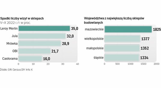 Najmocniej w przypadku Leroy Merlin, gdzie ruch spadł o 35 proc., a w sieci Jula o 32 proc. W przypadku pierwszej z nich może to być w części efekt apeli o bojkot sklepów tej francuskiej sieci, która po ataku Rosji na Ukrainę nie zdecydowała się na zamknięcie rosyjskich sklepów. Na minusie i to dwucyfrowym są wszystkie analizowane sieci marketów budowlanych, co może też być częściowo tłumaczone większą popularnością zakupów internetowych.