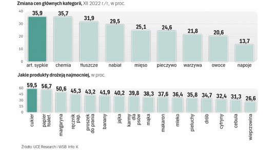 Ostatni miesiąc 2022 r. przyniósł wzrost cen o 24,8 proc., w porównaniu z 25,8 proc. w listopadzie – wynika z cyklicznego badania niemal 36 tys. cen z prawie 41 tys. sklepów 64 sieci, przeprowadzonego przez UCE Research i Wyższe Szkoły Bankowe. Choć wiele osób chciałoby odetchnąć, że szczyty zwyżek cen już za nami, niestety, niewiele wskazuje, aby faktycznie tak miało być.