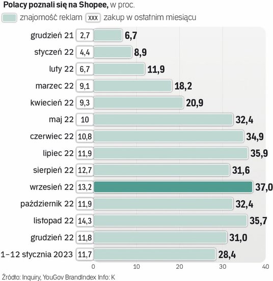 Dane firmy pokazują, że z miesiąca na miesiąc odsetek osób, które coś na Shopee kupiły, spadał. Szczytowy był listopad z wynikiem 14,3 proc., nawet w grudniu wynik był już sporo słabszy – 11,8 proc., i był na poziomie lipca. Jak na sezon świąteczny to słaby wynik.