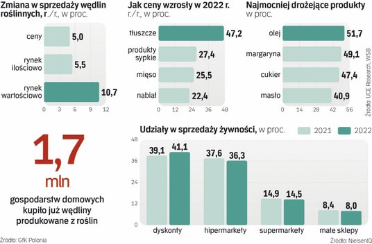 W badaniu dla platformy Pyszne.pl ograniczenie bądź wyeliminowanie mięsa z diety było jednym z najczęstszych postanowień noworocznych Polaków – zadeklarowało to aż 43 proc. badanych. Dotąd roślinne alternatywy dla produktów mięsnych były na tle rynku dość drogie, ale z danych GfK Polonia wynika, że zmiany wywołane inflacją są w ich przypadku mniejsze.