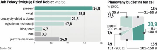 8 marca uczcić chce 46,3 proc. Polaków – wynika z badania GfK, które „Rzeczpospolita” poznała jako pierwsza. – Od kilkunastu miesięcy konsumenci zaciskają pasa i ograniczają wydatki. W efekcie aż 72 proc. respondentów wyda w ten dzień nie więcej niż 100 zł – mówi Anna Szwedowska, konsultant w GfK. – Dla porównania świętowanie walentynek zadeklarowało 39 proc. Polaków, a na podarunki o wartości powyżej 100 zł zdecydowało się wówczas blisko 40 proc. – dodaje.