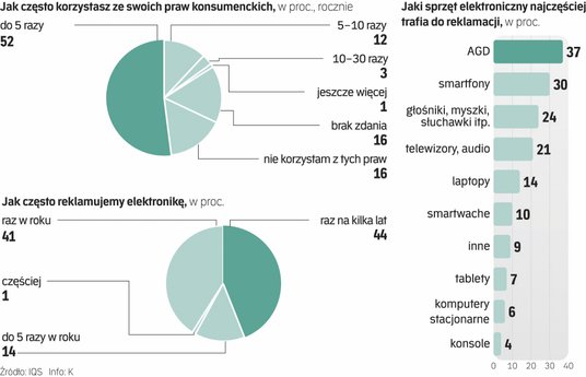 Z badania IQS dla Digital Care wynika, że elektronika to 43 proc. reklamacji, nieco poniżej 40 proc. wskazań zebrały odzież i obuwie. Tylko 12 proc. zgłaszało je w przypadku żywności, a usługi mają poniżej 10 proc. (w tym najwięcej, bo 9 proc. zrobiło to w przypadku firm telekomunikacyjnych, ale już banków – 4 proc., a 3 proc. wskazało usługi zdrowotne).