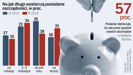 Choć ceny rosną, to konsumenci starają się oszczędzać, co przekłada się na redukowanie wydatków. Z marcowej edycji cyklicznego raportu „Current Consumer Mood” firmy GfK Polonia wynika, że już 21 proc. ma oszczędności, jakie wystarczą gospodarstwu domowemu na pół roku lub dłużej. Kolejne 18 proc. ma środki wystarczające na maksymalnie sześć miesięcy. To najwyższe wskazania, odkąd badanie jest prowadzone.