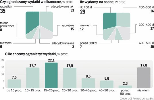 Przeszło 26 proc. Polaków przeznaczy na ten cel 200–300 zł, a 16,5 proc. – 300–400 zł. M.in. z powodu rosnącej inflacji blisko 68 proc. konsumentów zamierza obniżyć wydatki spożywcze w tym okresie. Ponadto z badania wynika, że najwięcej konsumentów przewiduje cięcia w świątecznym budżecie w zakresie od 15 do 20 proc. względem zeszłorocznych zakupów. Z kolei w porównaniu z ubiegłym rokiem najbardziej urosła grupa rodaków deklarujących przedział od 30 do 40 proc.