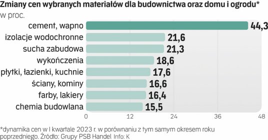 Malejąca produkcja jest konsekwencją spadającego popytu, a ten – przynajmniej częściowo – ciągle utrzymujących się wysokich cen. Z danych Grupy PSB Handel wynika, że w I kw., poza płytami OSB i drewnem, żadna grupa asortymentowa nie staniała w ujęciu rok do roku. Co więcej, wiele z nich drożało znacznie szybciej, niż wynosi inflacja. Szczególnie drogie są cement i wapno (średni wzrost cen o 44,3 proc.), izolacje wodochronne (+21,6 proc.) czy sucha zabudowa (+21,3 proc.).
