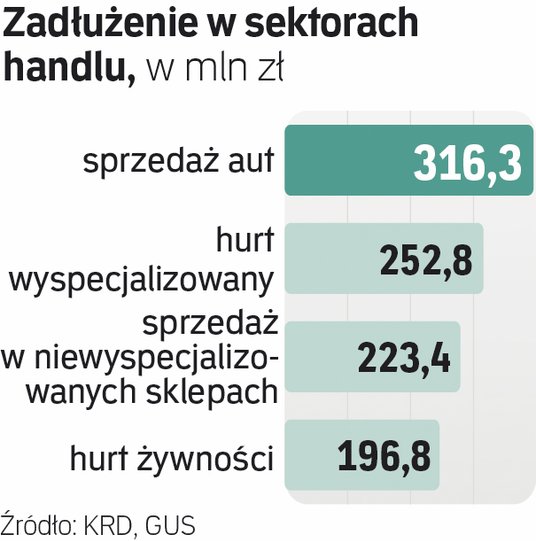 GUS podaje, że sprzedaż detaliczna w pierwszym kwartale 2023 roku zmalała o 3,5 proc. rok do roku. W samym marcu spadła o 7,3 proc. w stosunku do wyników sprzed roku. W efekcie handel jest najbardziej zadłużoną branżą w polskiej gospodarce, połowa zadłużenia przypada na hurtownie, wśród których 21,5 tys. dłużników musi oddać ponad 1 mld zł. Przedsiębiorcy mają tu do zwrotu przeciętnie 48,2 tys. zł. Na nieco mniejsze sumy zadłużeni są detaliści, bo łącznie na 842,5 mln zł. Jednak w spisie dłużników jest ich więcej niż hurtowni: ponad 31 tys. Statystyczny dług jednej firmy detalicznej to 27,1 tys. zł.