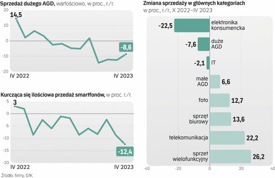 Kiepsko jest także na rynku AGD, którego sprzedaż ogółem w tym okresie była niższa wartościowo aż o 7,6 proc., zatem ilościowo spadek będzie dużo większy. Przy czym spada właściwie nieprzerwanie od sierpnia 2022 r., z lekkim odbiciem w grudniu. W 2023 r. spadki są już dwucyfrowe, nawet ponad 14 proc. w styczniu.