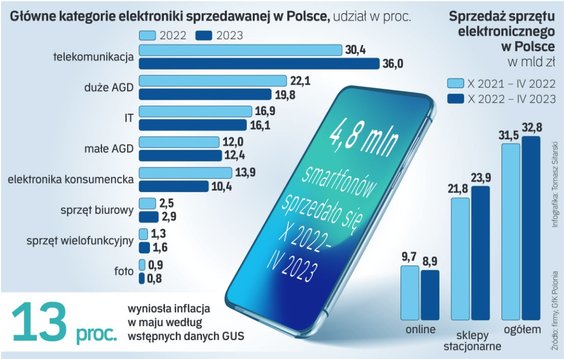 Nastroje są kiepskie, coraz gorzej jest nawet we flagowych segmentach, jak smartony. Ich sprzedaż ilościowo spadła w kwietniu o 12,4 proc. i kurczy się od czerwca 2022 r. Wartościowo rośnie w zależności od miesiąca nawet o 40 proc. (choć w kwietniu o niespełna 10 proc.), co pokazuje, jak mocno rosną ceny urządzeń.