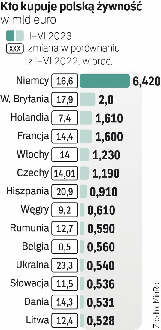 Na handlu z Francją i Holandią zarobiliśmy po 1,6 mld euro, potem Włochy z wynikiem 1,23 mld euro, a dopiero na szóstym miejscu są Czesi (1,19 mld). W 23-proc. tempie zwiększyła się sprzedaż żywności do Ukrainy.