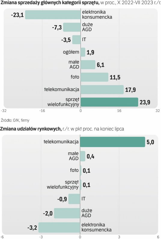 Tylko w lipcu wartość rynku elektroniki skurczyła się o 3 proc. rok do roku, w maju i kwietniu malała jeszcze mocniej, bo niemal o 4 proc., wynika z danych GfK. W raportowanym okresie od października do lipca jest co prawda 1,9 proc. na plusie, ale to efekt mocnych wzrostów z początku roku. Obecnie z miesiąca na miesiąc spadki w wielu kategoriach produktów się pogłębiają, i to mowa o tych największych – jak komputery i laptopy, telewizory oraz duże AGD.