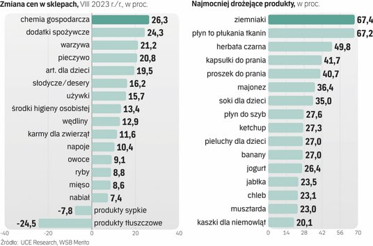 Z raportu wynika, że teraz najbardziej drożeje chemia gospodarcza, ze wzrostem 26,3 proc. r./r. – w lipcu to było 24,6 proc., ale w czerwcu jeszcze więcej, bo aż 34,6 proc. Poprzednim liderem wzrostu cen były warzywa, teraz ceny wielu uspokoiły się, poza choćby wspomnianymi ziemniakami, w sierpniu droższymi 67,4 proc. niż rok temu. W poprzednich miesiącach cebula czy marchew nawet w ujęciu rocznym podwajały ceny. W każdej kolejnej edycji nowe kategorie zaskakują skokami cen.