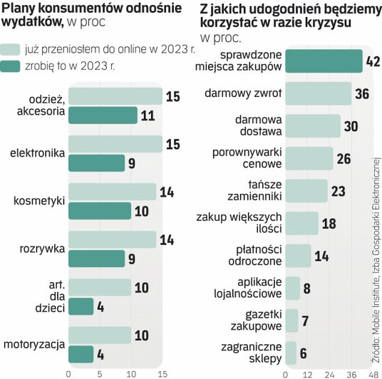 Największa grupa konsumentów właśnie zakupy sprzętu AGD i RTV oraz ubrań i modowych akcesoriów chce przenosić do kanałów internetowych. Z raportu Mobile Institute i Izby Gospodarki Elektronicznej wynika, że w 2023 r. zrobiło tak już po 15 proc. ankietowanych. Z kolei takie plany na kolejne miesiące roku ma 9 proc. w przypadku elektroniki oraz 11 proc., jeśli chodzi o akcesoria i ubrania.