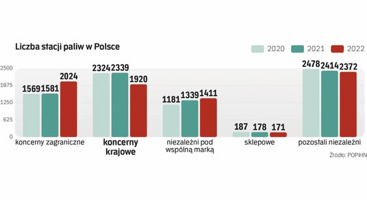 Według danych Polskiej Organizacji Przemysłu i Handlu Naftowego na koniec 2022 r. przy sklepach działało 171 stacji paliw, wobec 178 rok wcześniej. Nie jest to jednak efekt spadku zainteresowania tym segmentem, lecz ostatecznym wycofaniem się z polskiego rynku firmy Tesco, która operowała na znacznej liczbie stacji paliw przy swoich sklepach. Nowy właściciel sklepów nie przejął z nimi stacji paliw i trafiły one do innych operatorów. Tym samym ogólna liczba stacji przy tego typu obiektach handlowych się zmniejszyła.