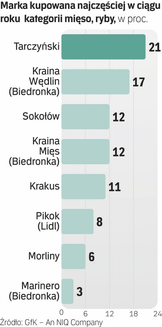 Produkty marki własnej Biedronki – Nasze Smaki – są najczęściej kupowane w kategorii dań gotowych. Podobnie jest z inną marką własną tej samej sieci – Go Vege, która jest najbardziej popularna, jeśli chodzi o roślinne zamienniki mięsa i nabiału – wymienia ją wśród kupowanych 20 proc. osób. Świetnie radzi sobie także Kraina Mięs (Biedronka) i Kraina Wędlin (Biedronka), które plasują się w pierwszej piątce, po które najczęściej sięgają polscy konsumenci, gdy mówimy o mięsie i rybach i mają po 12 oraz 17 proc. wskazań. W czołówce jest także Pikok z oferty Lidla z 8 proc. wskazań.