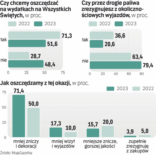 Na pytanie, czy konsumenci zamierzają ograniczyć wydatki z tej okazji, odpowiedzi twierdzącej udzieliło aż 51,6 proc. – wynika z badania serwisu Moja Gazetka, agregatora ofert promocyjnych. Choć to mniej niż przed rokiem, kiedy wydatki ograniczać chciało 71,3 proc., to jednak sygnał ostrzegawczy. Przed rokiem 36,6 proc. badanych zadeklarowało, że z uwagi na wysokie ceny paliwa odwiedzi mniej miejscowości, gdzie znajdują się groby najbliższych. W aktualnym badaniu odsetek ten jest dużo mniejszy i wynosi 20,6 proc.