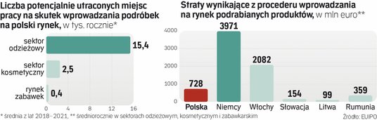 Podrabiane odzież, zabawki i kosmetyki to nad Wisłą wciąż gigantyczny problem. Jak wynika z najnowszych danych EUIPO (Urząd Unii Europejskiej ds. Własności Intelektualnej), na skutek tego nielegalnego procederu tylko w tych trzech sektorach corocznie w naszym kraju dochodzi do utraty ponad 18 tys. miejsc pracy. Dla porównania w całej UE to prawie 200 tys. Widać wyraźnie, że niemal co dziesiąte miejsce pracy, które nie powstało we Wspólnocie w efekcie produkcji fałszywek, dotyczy polskiego rynku. To pokazuje, że skala problemu w Polsce jest ogromna. Gorzej pod tym względem wypadają tylko Niemcy i Włochy.