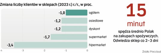 Największy spadek ruchu, aż o 8,1 proc., odnotowała w hipermarketach. Licząc rok do roku spadek zaliczyły niemal wszystkie formaty sklepów: w supermarketach o 1,4 proc., a w sklepach osiedlowych o 3,2 proc. Jako jedyne na lekkim plusie były dyskonty: w 2023 r. zanotowały wzrost ruchu o 1,2 proc.
