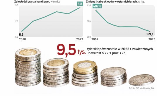 Kłopoty sektora widać także po innych danych. Na koniec 2023 r. liczba sklepów spadła poniżej 370 tys., co oznacza, że w rok skurczyła się o ponad 3 tys. Jak podaje wywiadownia Dun & Bradstreet, kolejne 10 tys. działalności gospodarczych zostało bowiem w tym okresie zawieszonych.