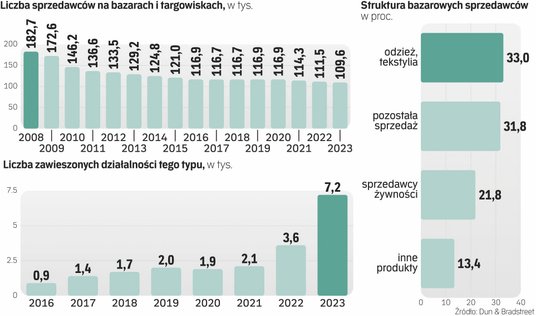 To jednak nie jest pełen obraz sytuacji tego typu sprzedawców. W 2023 roku jednocześnie podwoiła się liczba zawieszonych działalności i stało się tak z ponad 7,2 tys. firm sprzedających na bazarach i targowiskach. – Ogółem tylko w ostatnich dwóch latach zawieszono w Polsce ponad 11 tys. firm, co stanowi 10 proc. całości rynku, czyli 10 proc. wszystkich aktywnie działających przedsiębiorstw – mówi Tomasz Starzyk.