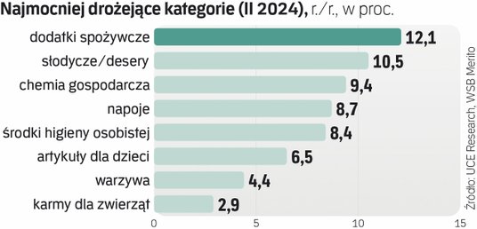 Na 17 monitorowanych kategorii 10 wykazało jednocyfrowe wzrosty r./r. (w styczniu było takich osiem), dwie kategorie zaliczyły dwucyfrowe wzrosty – słodycze i desery oraz dodatki spożywcze, czyli keczupy, majonezy czy musztardy. Już pięć kategorii było w trendzie spadkowym, co jest jednak efektem odreagowania rekordowych wzrostów z 2022 i 2023 r.